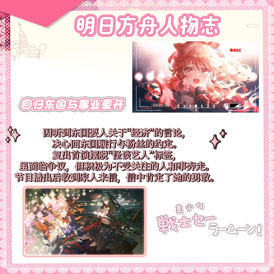 经星熊推荐,遥签约罗德岛,负责与东国交流。起初默许“萌萌香”称呼,后改用本名,仅签名时偶写旧艺名✍️。她未弃偶像身份,会签名、唱自己的歌,也会扮角色哄孩子,却仍怕罗德岛灵异事👻。