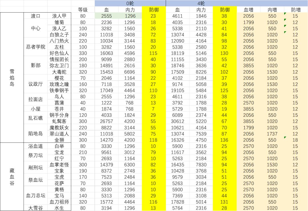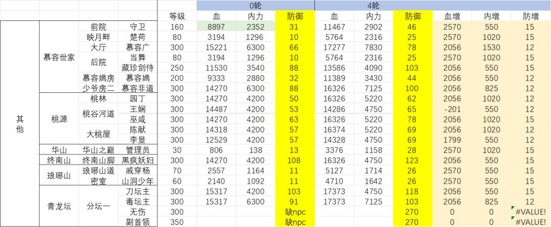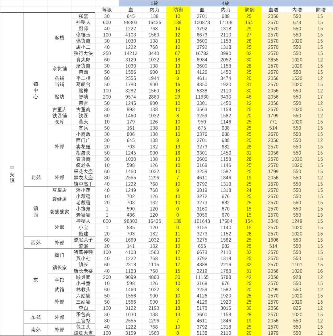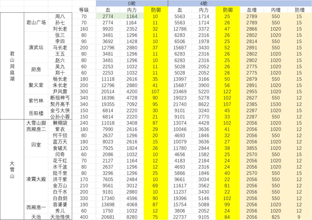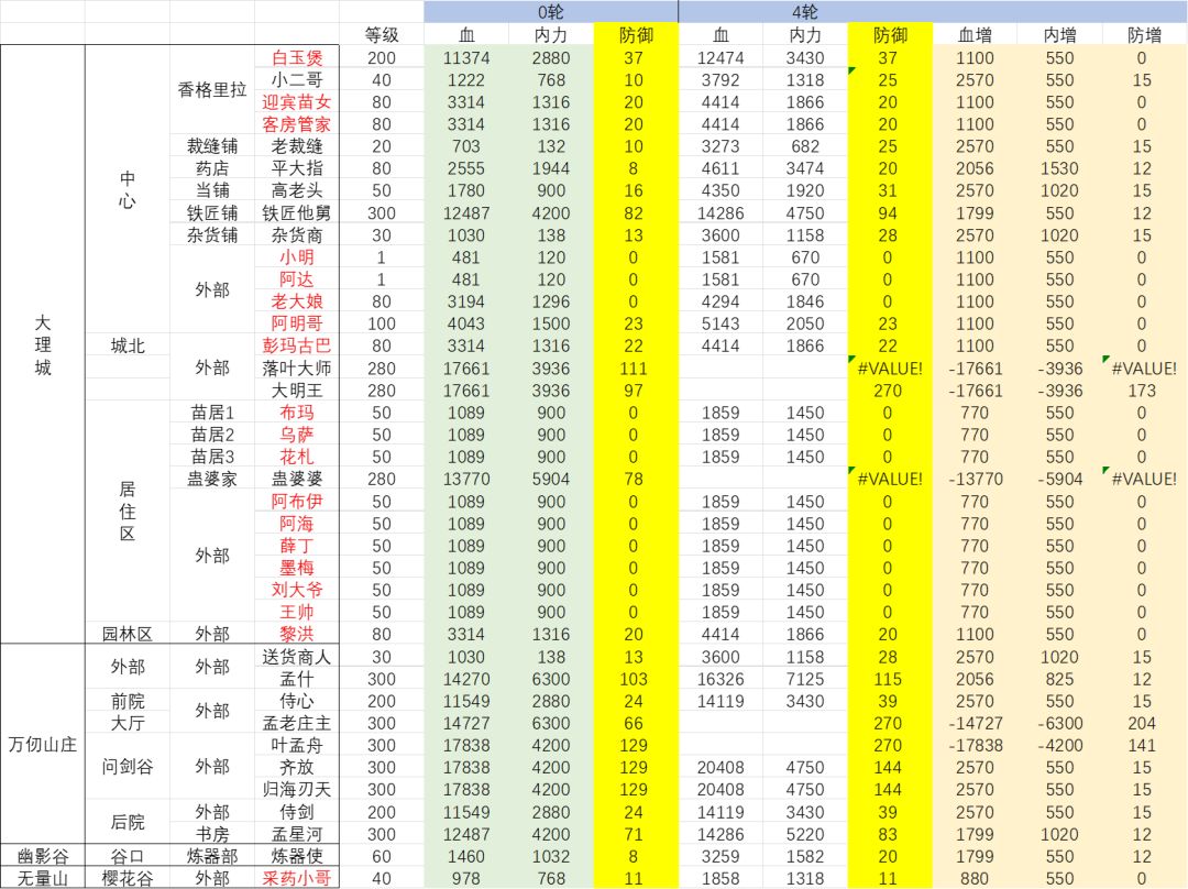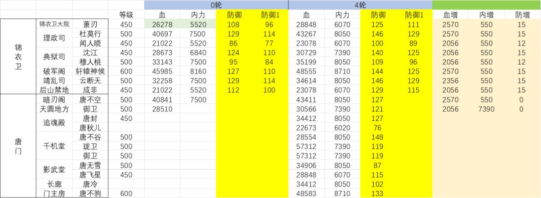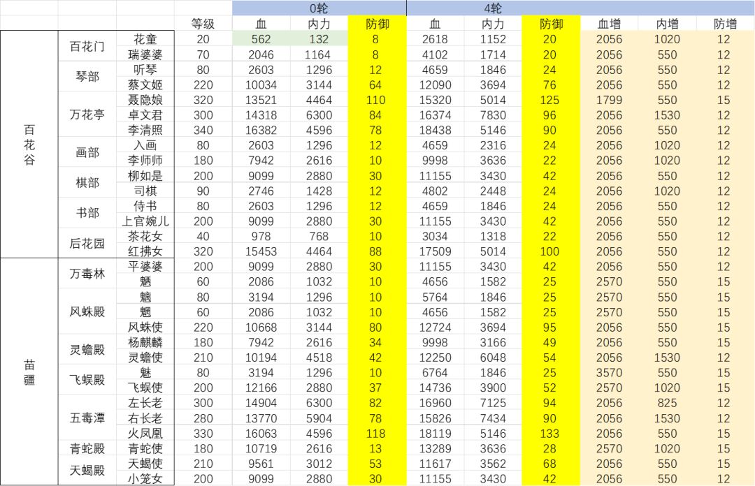 以前记录的某些名字对不上。有的剧情没解锁。含0和4轮,已列出增长值。有易筋经和金鳞功的防御推算成无额外防御时,增长满足规律。等级按0轮计算。0轮无减伤,4轮减伤15%。红名的防御和减伤不随轮回增长