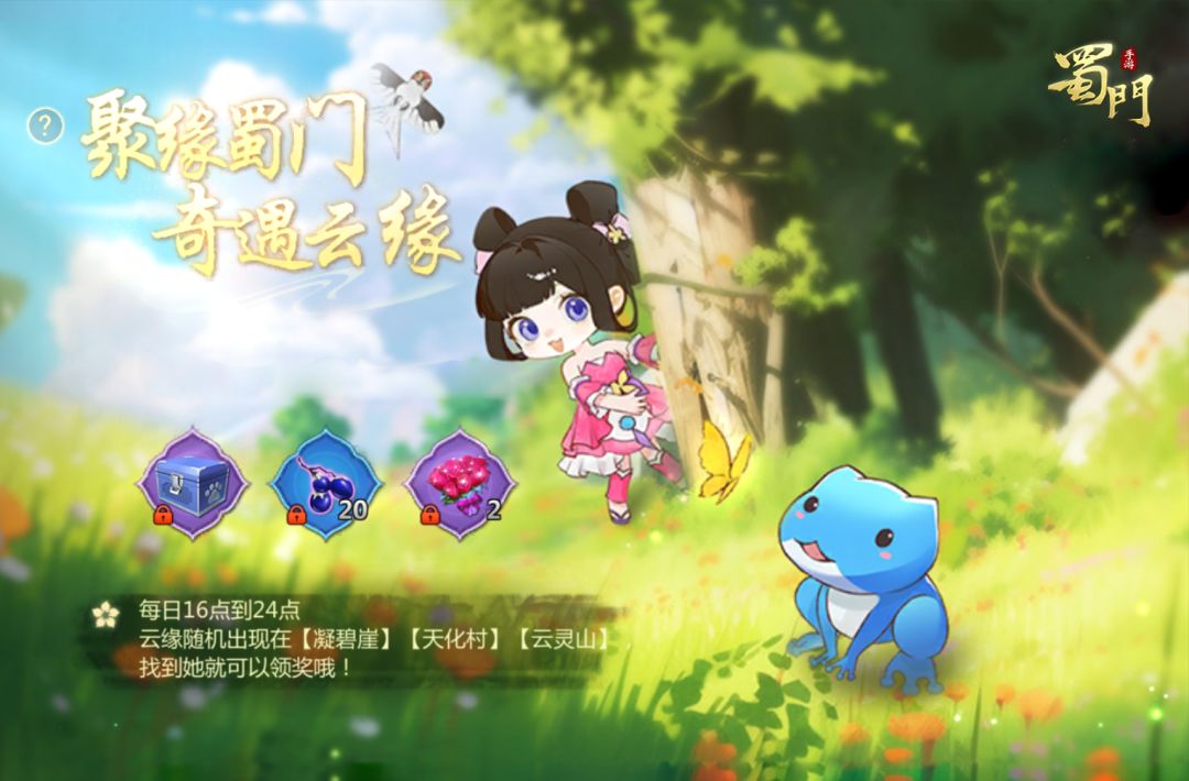 活动内容:每日16点到23点活动开启后云缘会随机出现在凝碧崖、云灵山、天化村这三个地图里,每到一个整点云缘就会刷新位置,找到云缘就会获得奖励。
