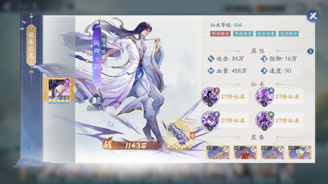 面板数值(含书仙录默认装备及侠客升星加成)为: