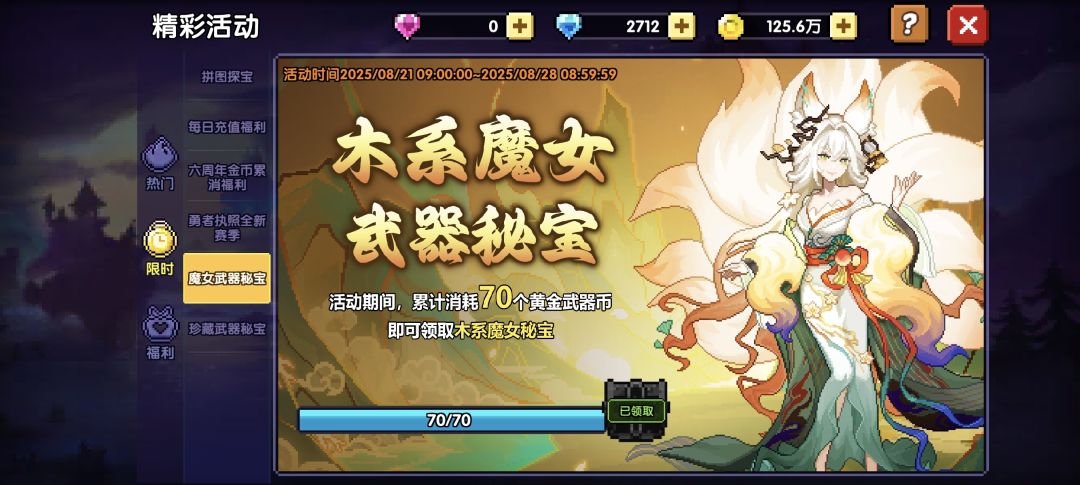 特殊情况下,也可以提前做新魔女武器,推到小秘境70层时,通过魔女典藏获取新魔女的紫技能