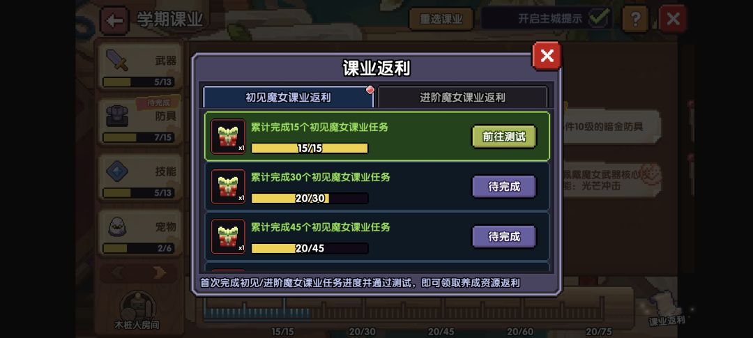 当你达成一定进度的时候可以在右下角课业返利领取奖励