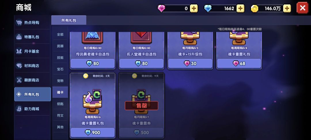 魂卡区的东西,只推荐买500钻的重置券。当你卡关时,可以买一点80钻一张的卡包(5张以内)