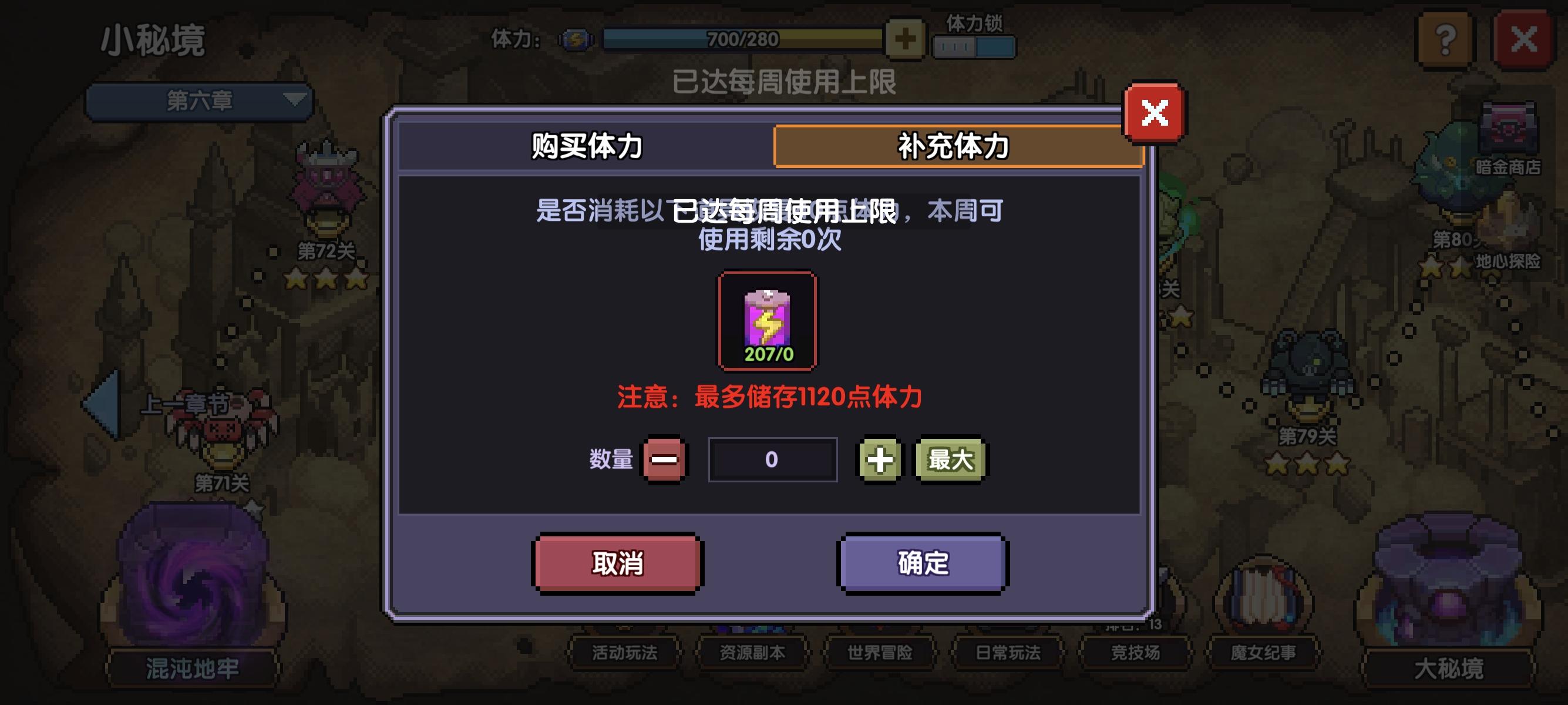 每天4:00会加280体力,上限是1120,建议是体力高于840的情况下先去消耗消耗再下线