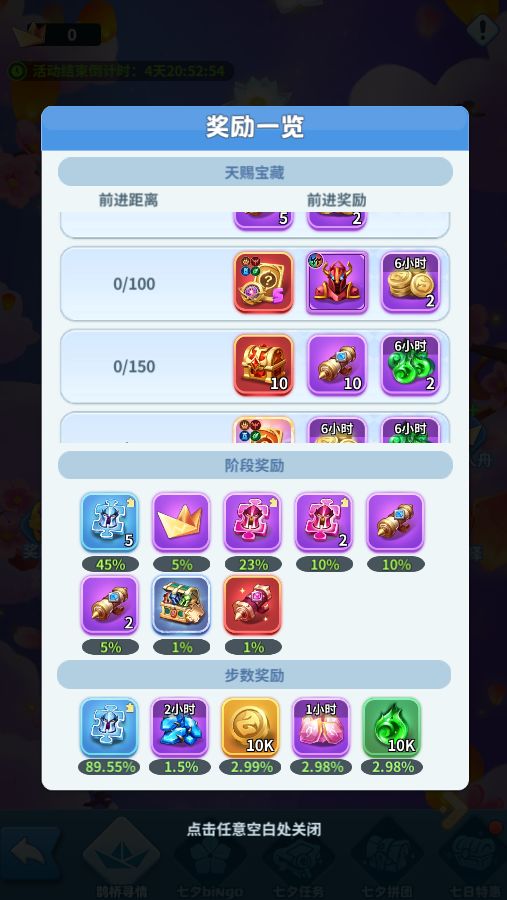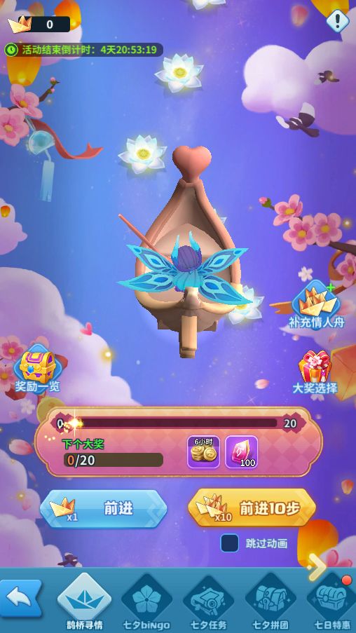 活动期间,旅行者可消耗情人舟补充体力前进,每前进1步都能获得奖励,到达特定档位可获得丰厚大奖。沿着星河,与萤火乘着情人舟前行吧!