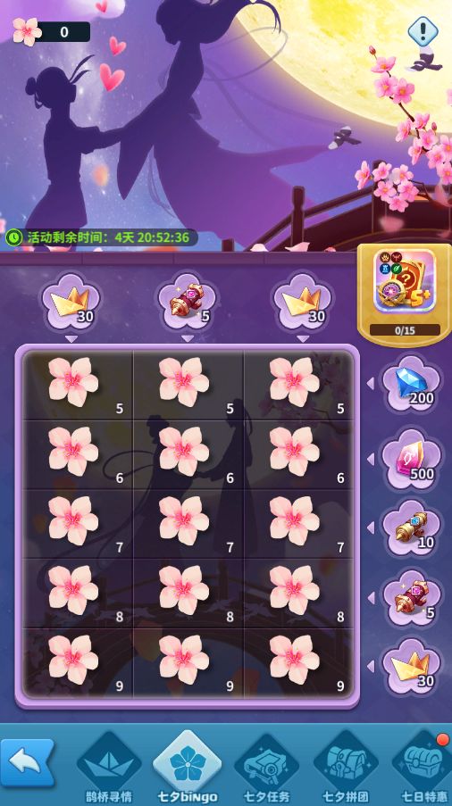 活动期间,旅行者可以通过完成七夕任务获得桃花,使用桃花解锁bingo拼图格,完成横纵连线,即可获得对应奖励。更有“情人舟”和“四系S+英雄卡/圣物自选卡”相赠。