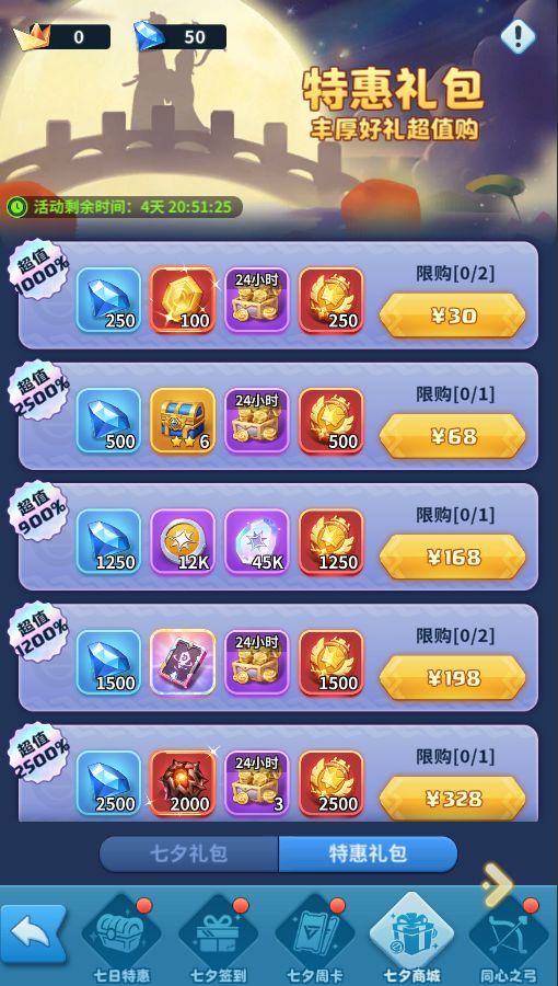 活动期间,七夕商城限时开启,多款节日礼包与特惠礼包登场,不容错过。