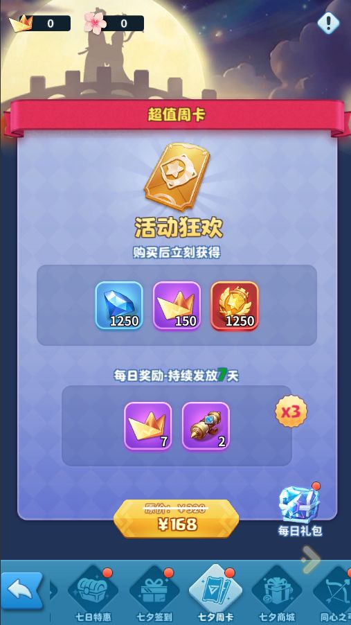 活动期间,七夕周卡活动开启,购买周卡可获超值奖励。