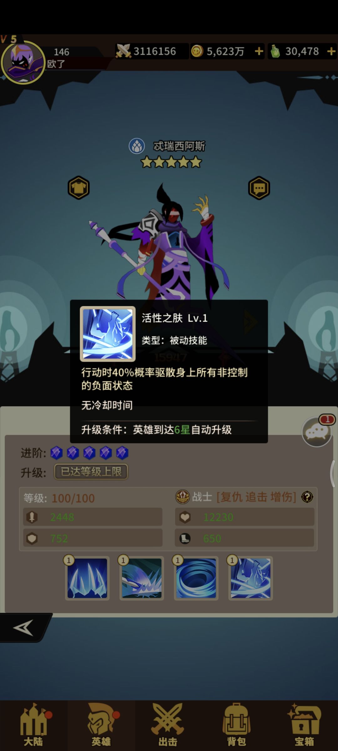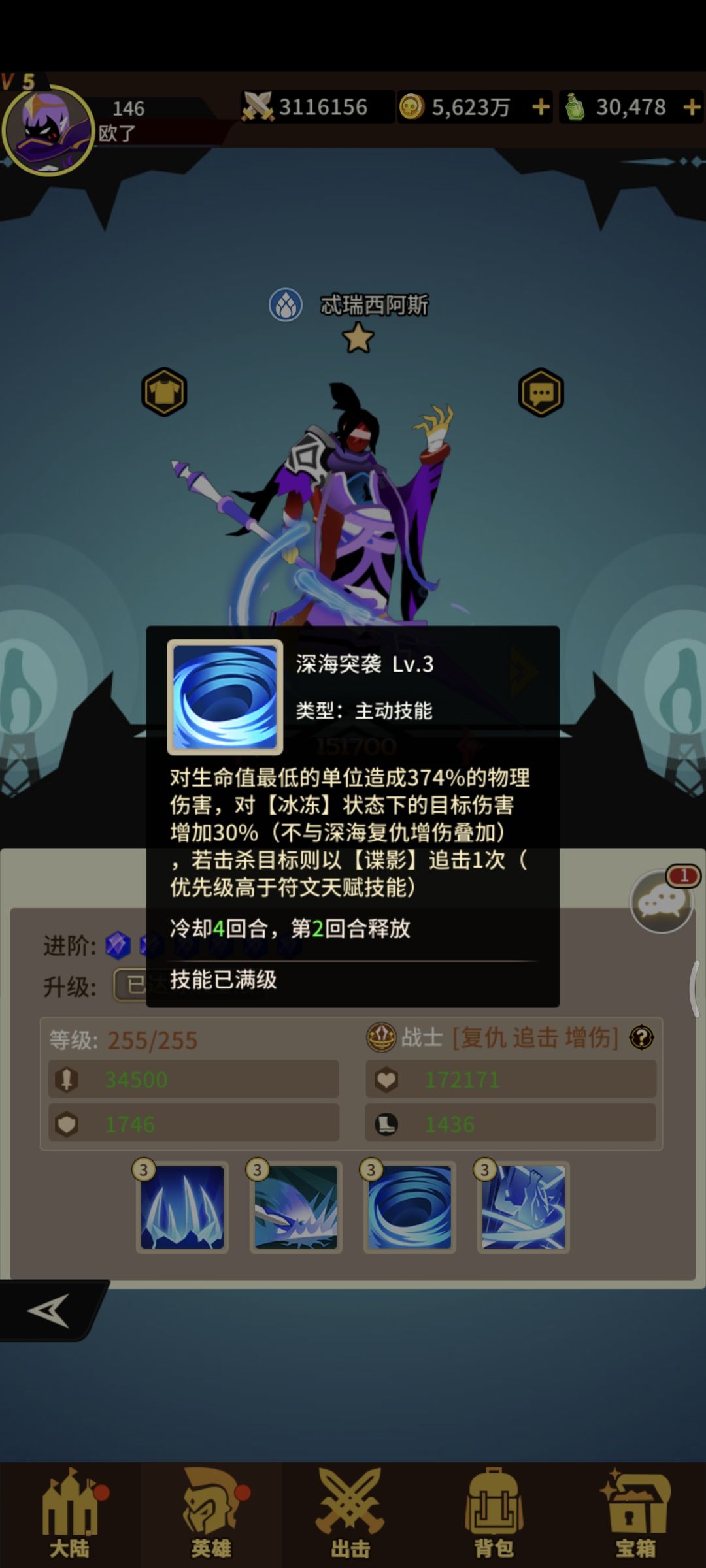 水系战士四技能!获取难度难!抽卡+宝箱+兑换!一技能打中后排两个附带吸血 二技能+攻击+生命+暴击 满级增加被打血量上限30%减少伤害20%附带深海复仇(优先打携带该状态的!增加30%伤害)三技能打生命最低的对冰冻状态敌人增加伤害!满级若击杀敌人一技能再追加一次 四技能行动时概率驱散异常状态前期非常好用的战士!值得拥有