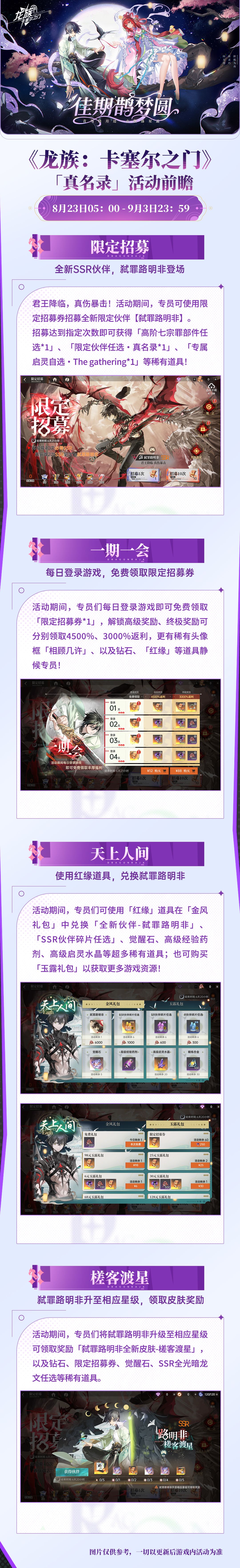 活动期间,全新SSR伙伴弑罪路明非开启限时招募!将伙伴升至指定星级即可解锁「弑罪路明非全新皮肤-槎客渡星」!