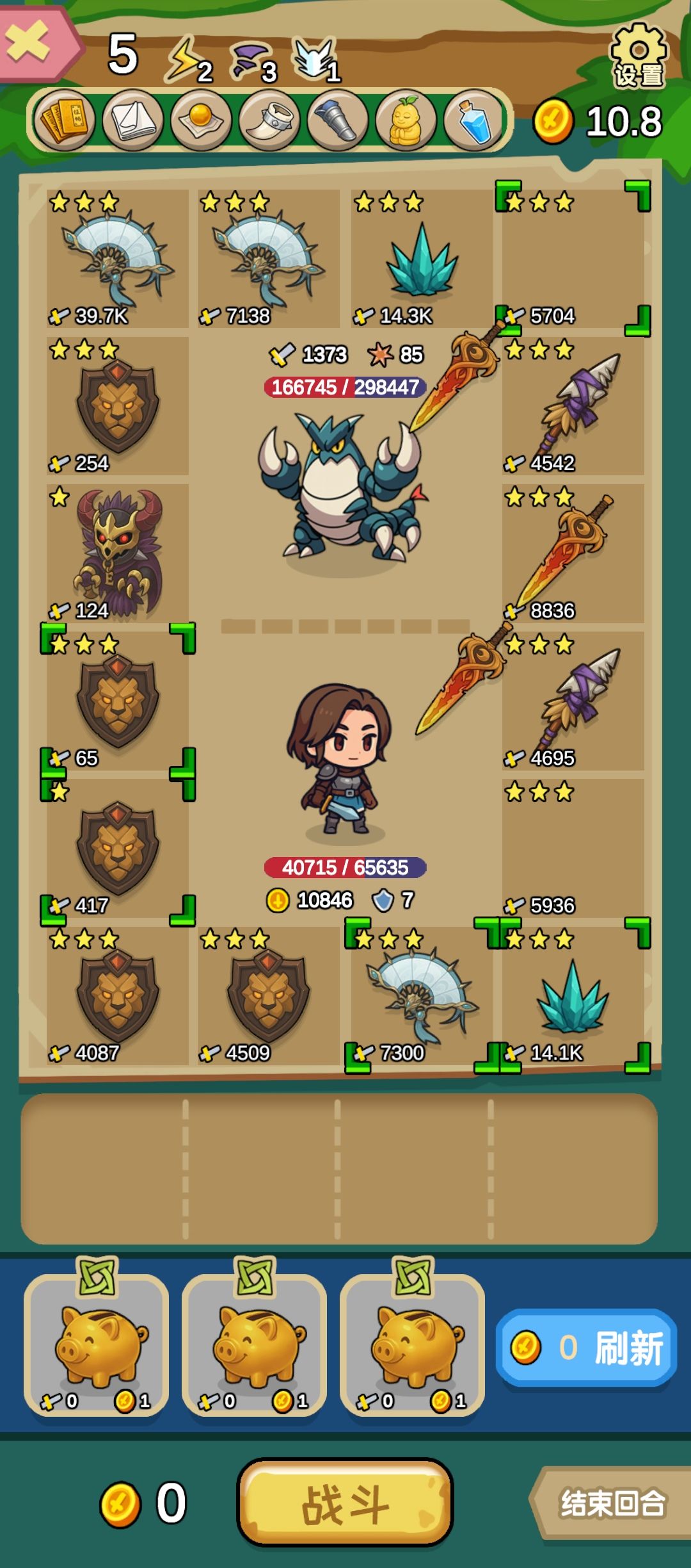 第二关拿掉自己血,配合金币盾牌扣一血,一直下回合,吃利息。无限刷钱需要配合买卖治疗,不如到后面的图刷
