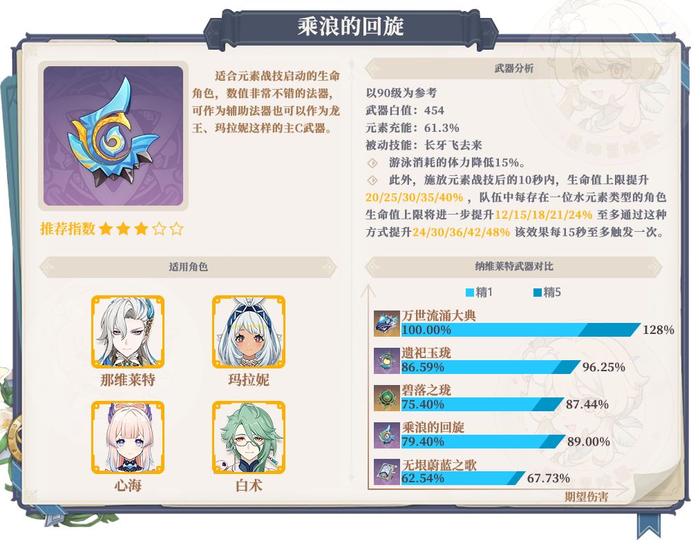 4、乘浪的回旋抽取建议:限定武器,适配那维莱特、心海、白术、玛拉妮,打不过锻造武器金珀,所以不推荐抽取