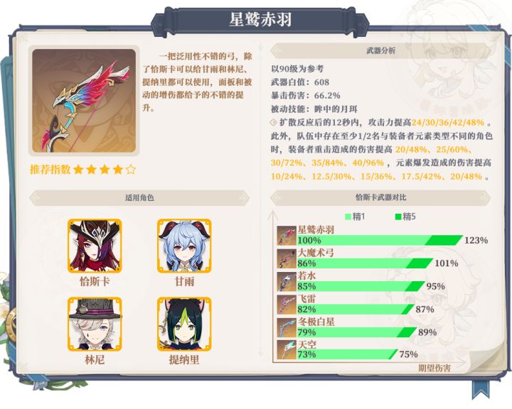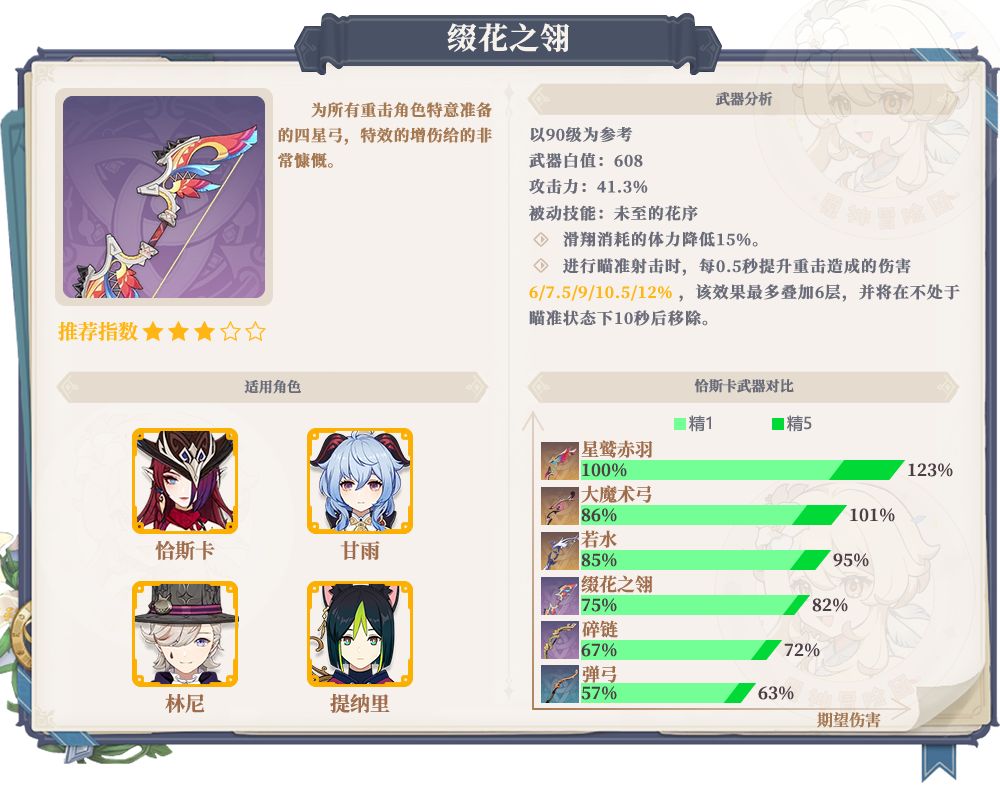 5、缀花之翎抽取建议:恰斯卡的四星专武,没有合适的五星武器的话是最好的四星下位,不过不建议专门抽一把