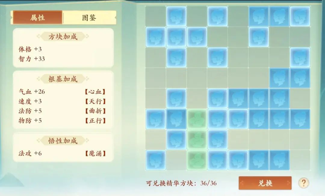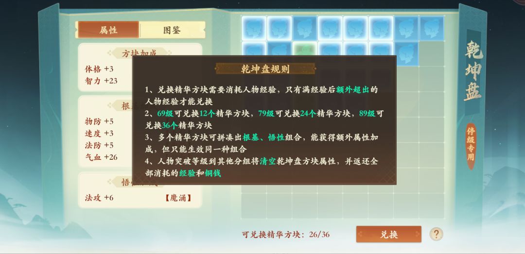 关于乾坤盘的系统介绍,雷震子在这里不过多赘述啦。乾坤盘是我们游戏内卡级专属的系统,简而言之,言而简之:卡级后可以将多余的经验兑换成方块属性,搭配组成对应方块图案,可以激活更多的属性加成。