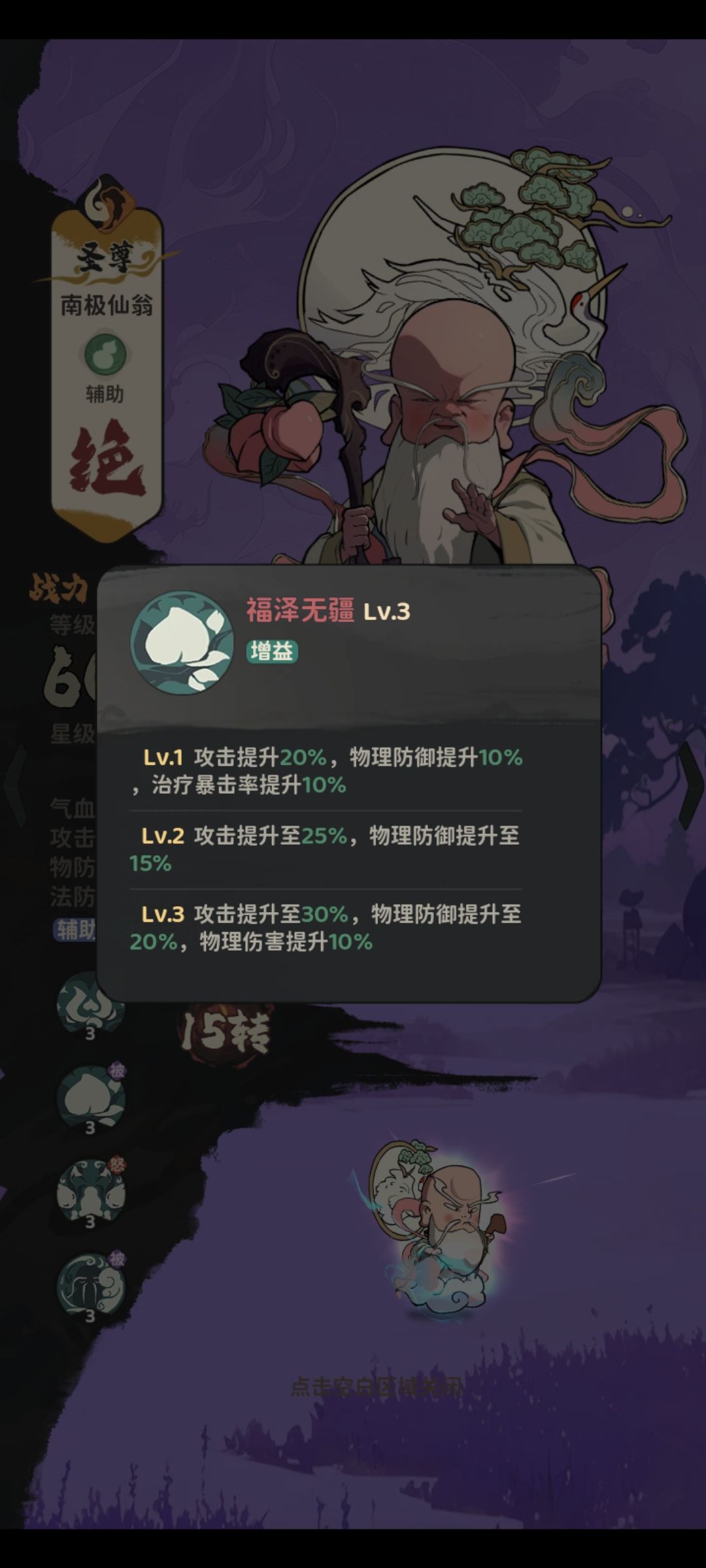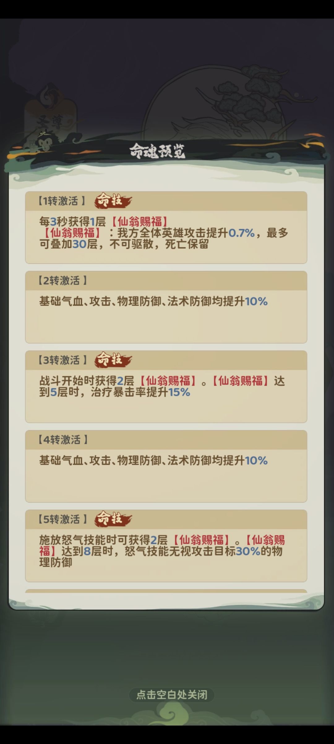 1转性价比挺高的,仙翁赐福可以说是目前最强的命魂buff,每层全体增加攻击力,不会驱散死亡保留,可惜只有一转的话叠的很慢,3秒一层要叠一分半才叠满,这游戏战斗总时长也才一分半。