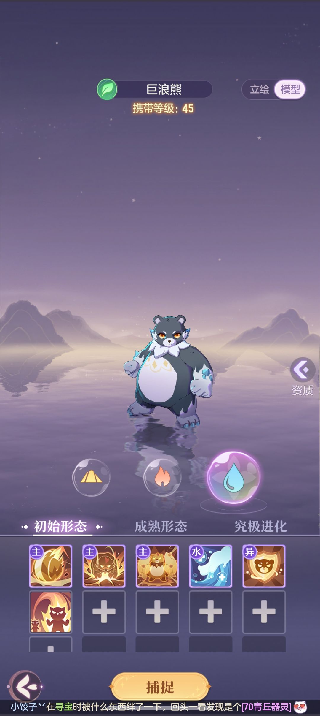 45级宠:水熊,低等级唯二能够用到后期得尾速配速宠,速度资质越低越好