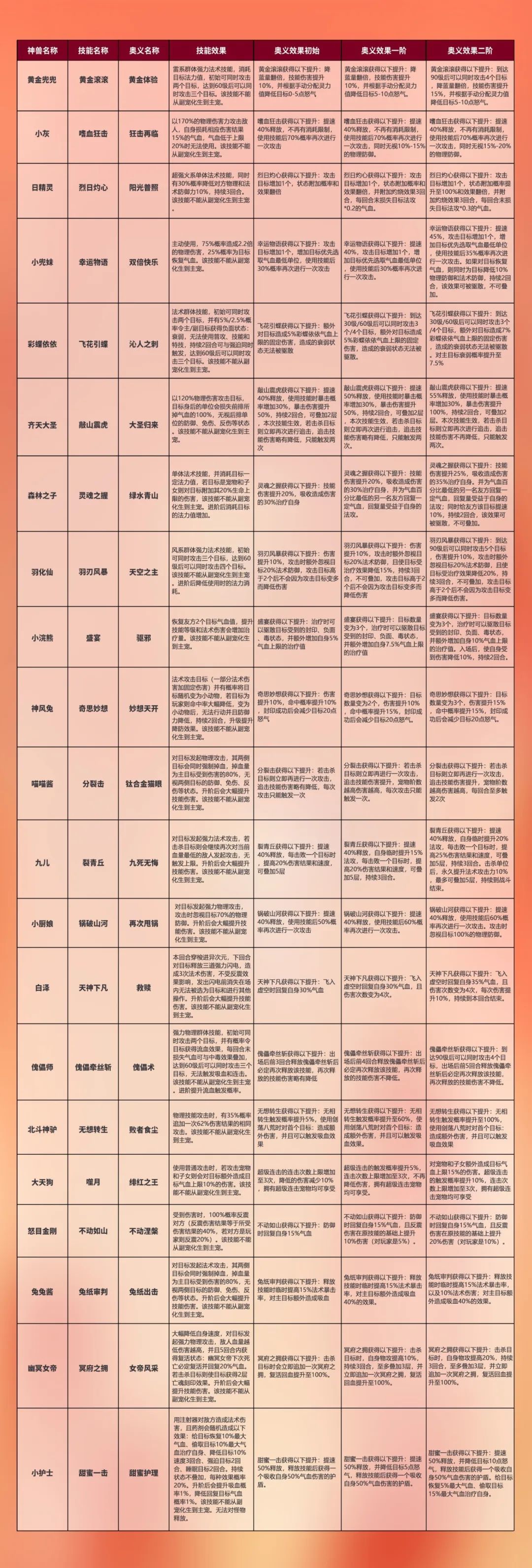 鉴于本次版本更新中,获得奥义升阶效果的神兽数量较多,兜妹为大家准备一张表格,让大家能够一目了然,更快了解本次的奥义升阶都有哪些详细内容。(点击查看大图,放大更清晰⬇️)