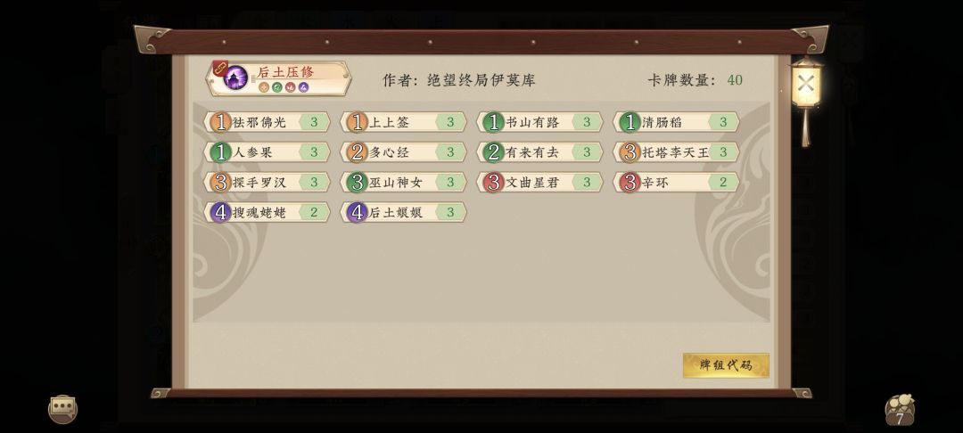 后土娘娘配合驱邪佛光、清肠稻、有来有去可以单回合反复触发特定生灵的死亡能力,而文曲星君是这个组合目前最好的致胜手段;与人参果的配合可以抽到牌库中剩下的驱邪佛光/辛环。