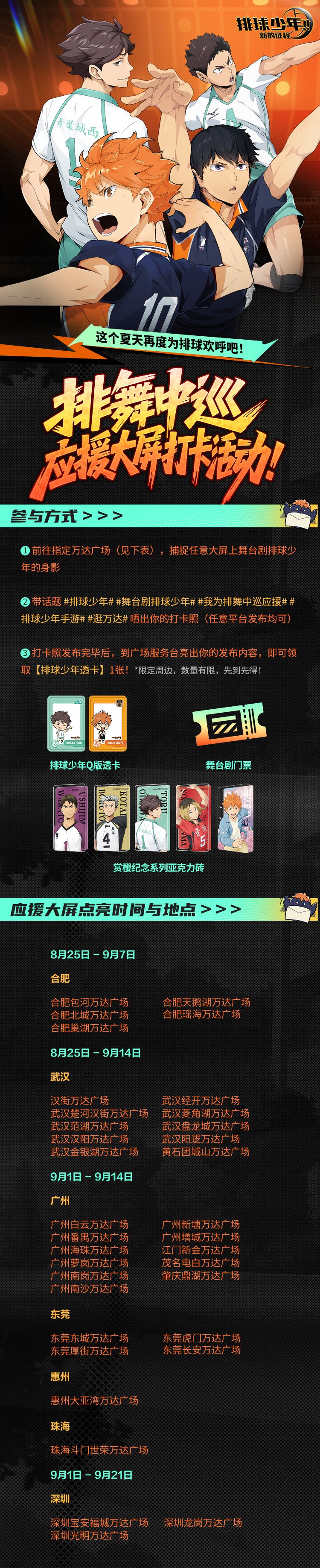 喜欢小排球的你看过来!舞台剧排球少年+万达广场+排球少年手游为排粉送上好礼,万达广场大屏打卡活动第二轮即将启动!