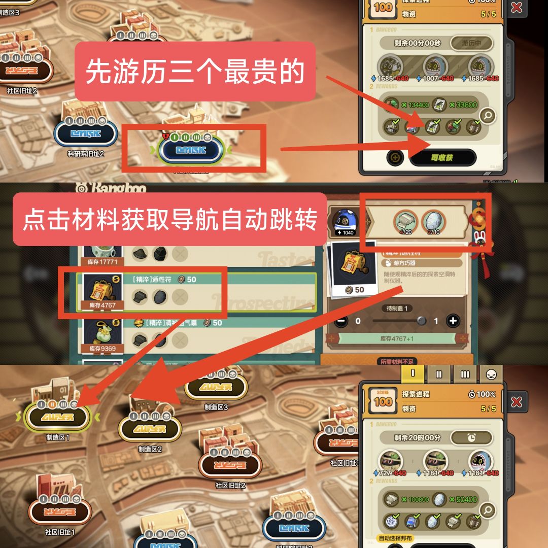 首先点击游历,进入对应界面,优先游历最贵的三个材料,然后点经营制造这三个,就在最顶上三个。