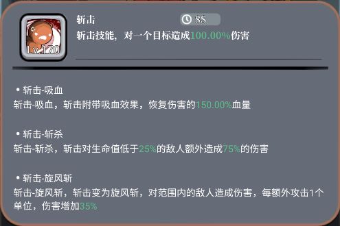 T0技能:斩击,最强的就是他第三个词条回复效果,满级恢复百分之150伤害的血量(8秒cd)。