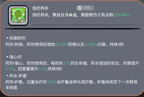 T1技能:治疗药水,这个技能回血是其次加buff才是最有用的,因为cd30秒,太长了,回血效果和斩击一样都是回满血,但是斩击只有8秒。