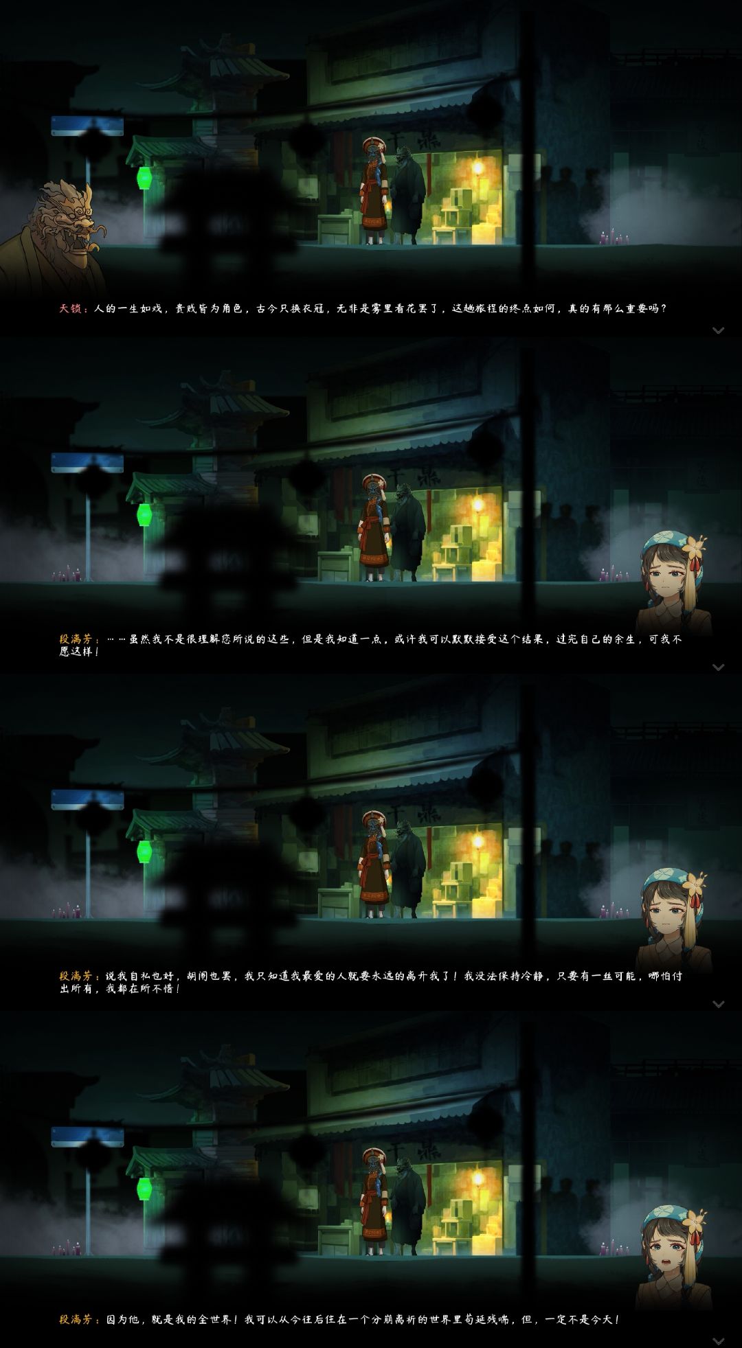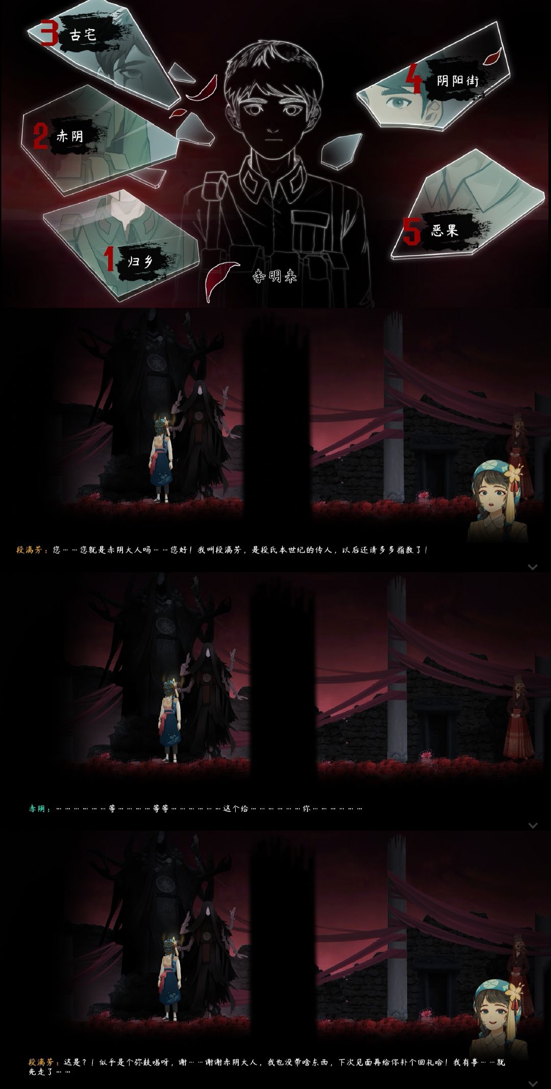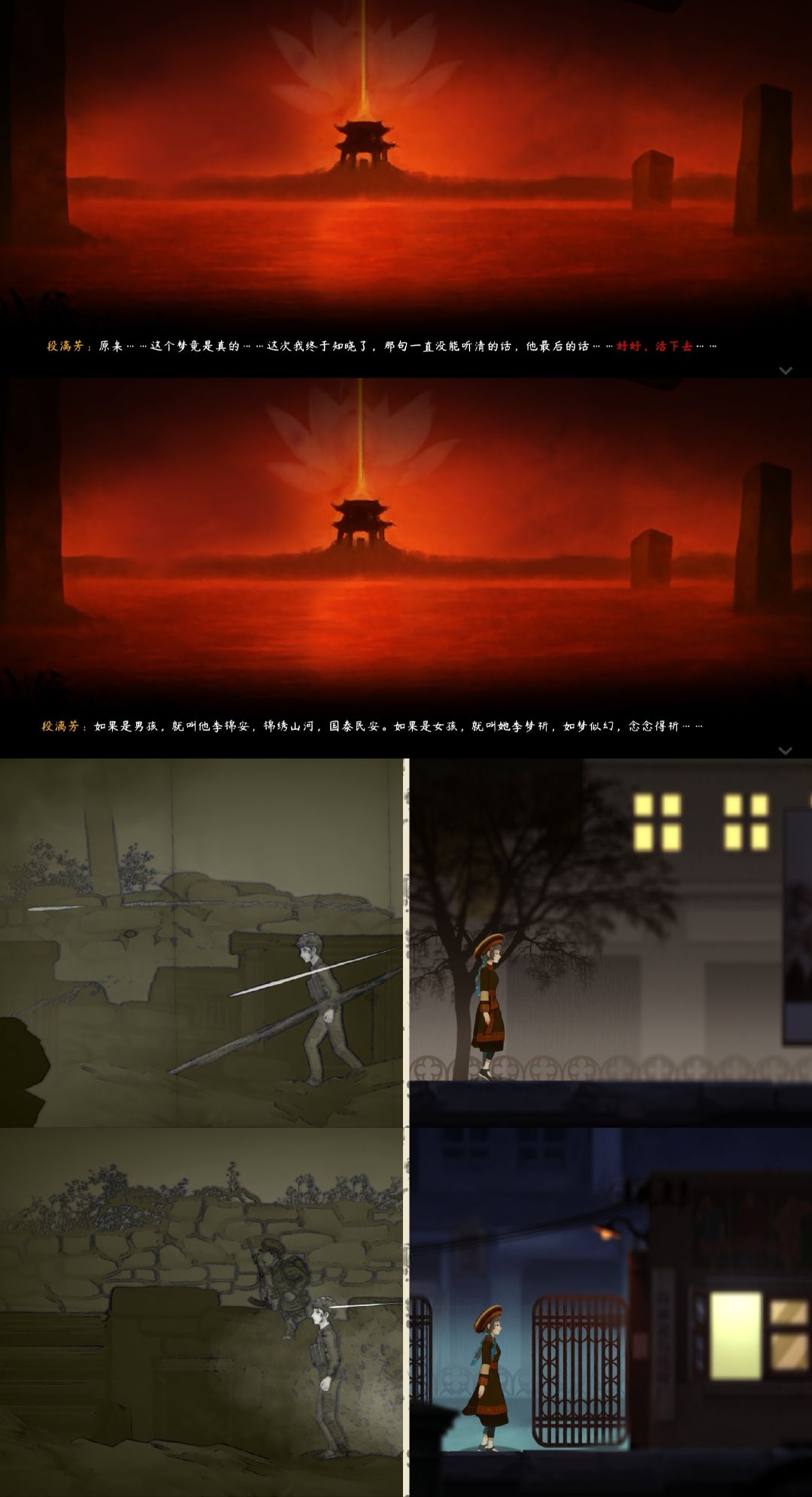 游戏主章节到这里就结束了,虽然比较短,但仍能让玩家为段漓芳和李明来的爱情而感动:爱是保家卫国,爱是勇敢无畏,爱给予他们力量。接着进入番外【段宅魅影】,真的很折磨人,在这里用的时间早已超过了主章节。不知道在段氏古宅和阴阳街、静谧之森、彼岸花海之间跑了多少趟,买驱灵符、赚钱、翻新古宅、采彼岸花、解谜题,做菜、制药、染布……