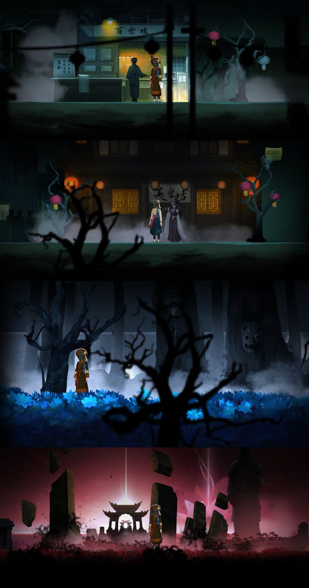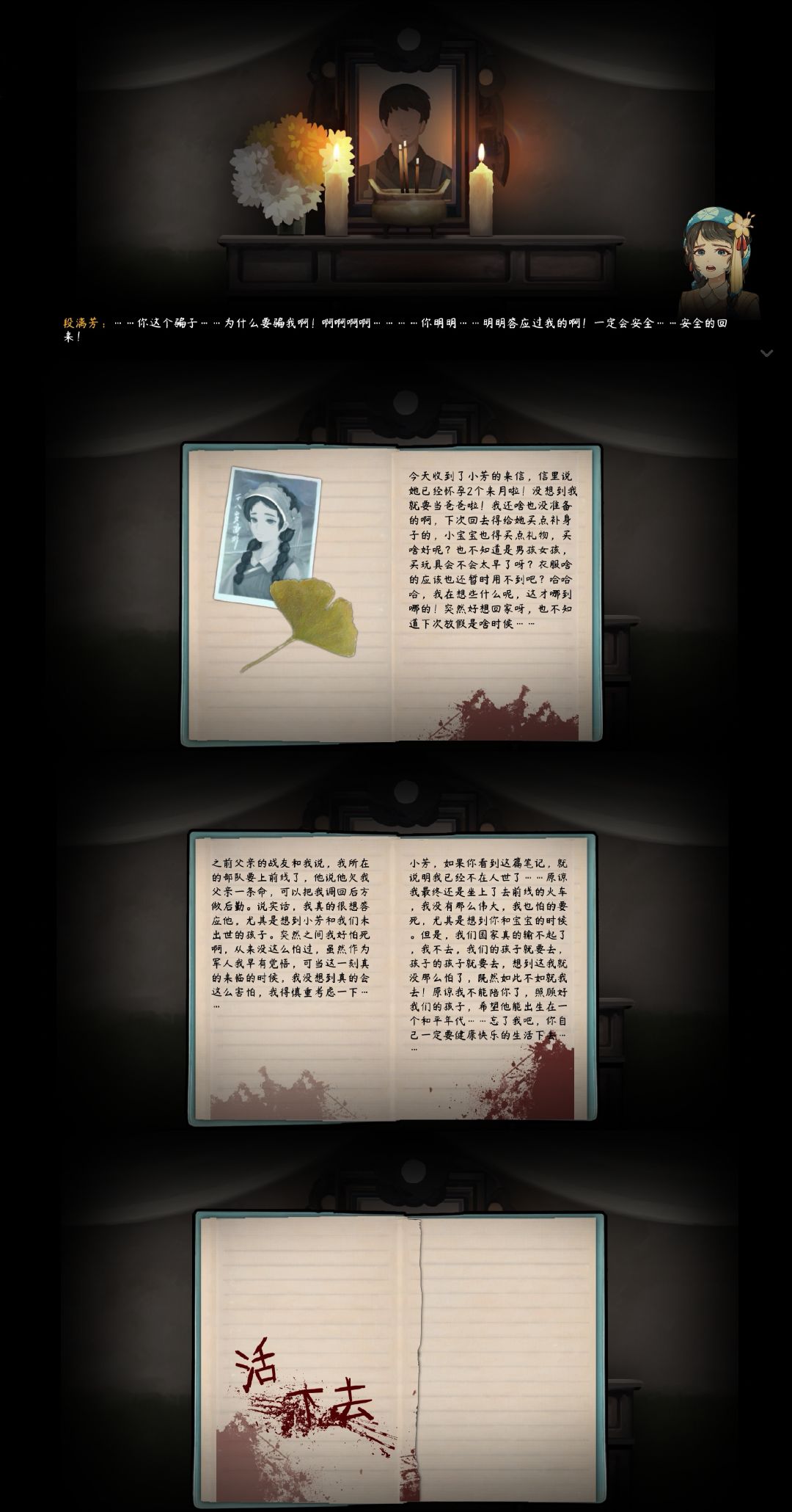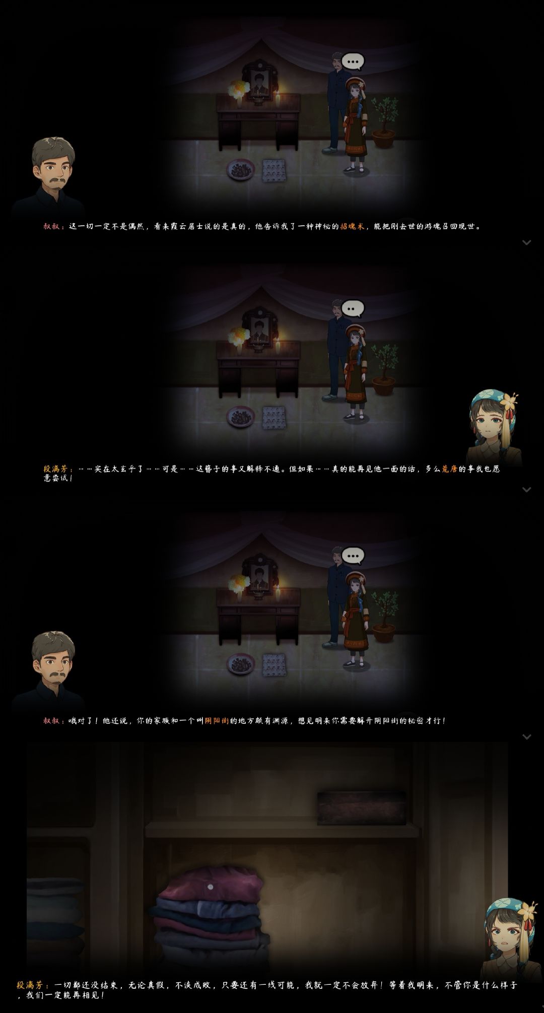 游戏主章节到这里就结束了,虽然比较短,但仍能让玩家为段漓芳和李明来的爱情而感动:爱是保家卫国,爱是勇敢无畏,爱给予他们力量。接着进入番外【段宅魅影】,真的很折磨人,在这里用的时间早已超过了主章节。不知道在段氏古宅和阴阳街、静谧之森、彼岸花海之间跑了多少趟,买驱灵符、赚钱、翻新古宅、采彼岸花、解谜题,做菜、制药、染布……