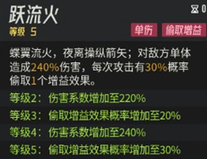 对敌方造成240%的伤害,并且有30%的概率偷取敌方buff技能,推荐点到等级4
