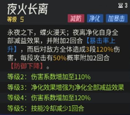 夜离净化自身所有DeBuff后,给自身附加两回合暴击上升,对敌人造成3段120%伤害并有50%概率给对方上防御降低DeBuff。夜离的核心输出技能,推荐点满