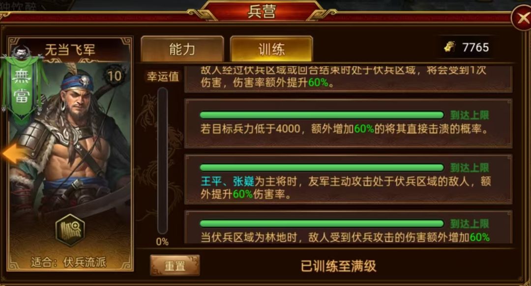 王平亲和最大培养至91,利用兵书培养次数的机制,可以拉升至100。即王平亲和89的时候,不再培养兵书,校场里吃高级亲和(灵光一闪),然后保存。
