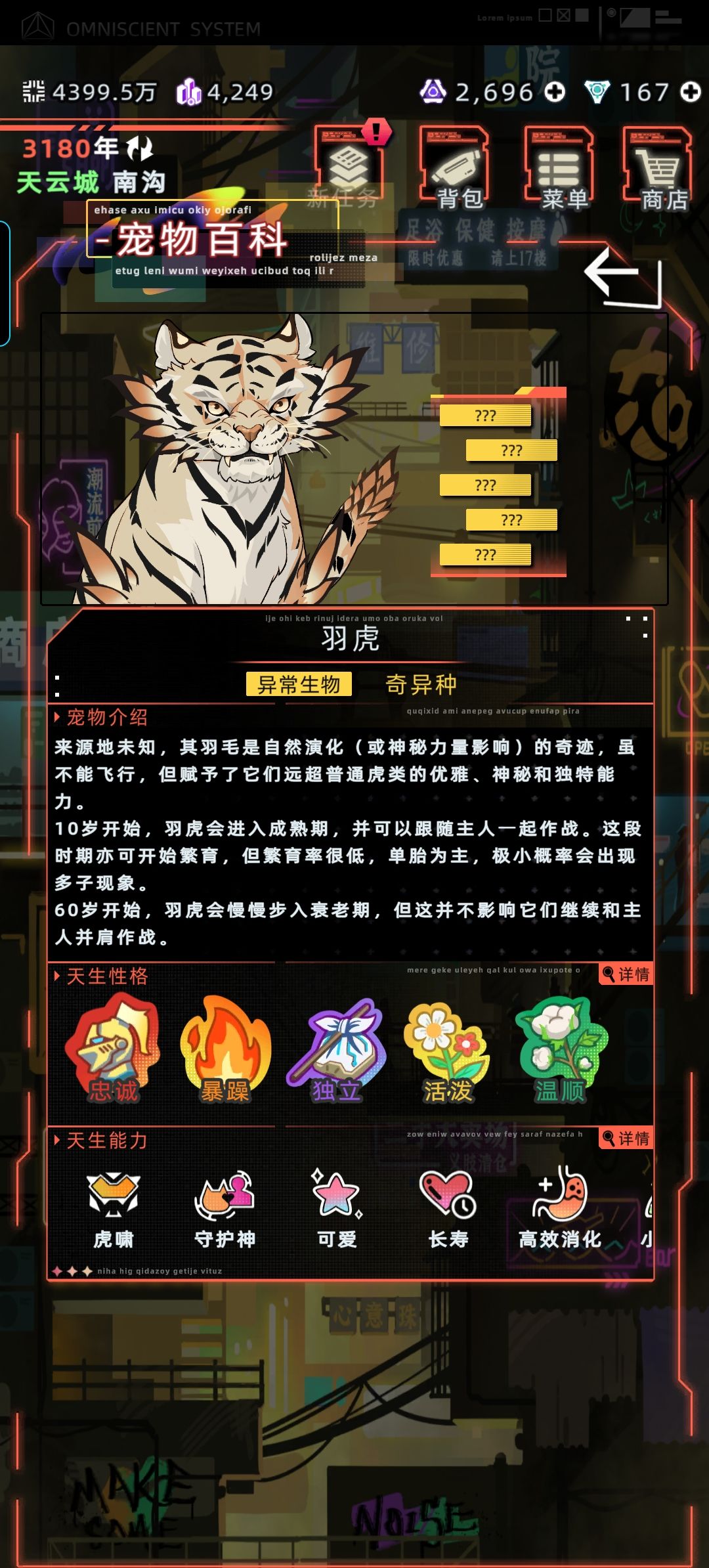 ①宠物[羽虎]:可组队战斗,怀孕十年一胎,寿命百年起步,价格一般在百万左右(