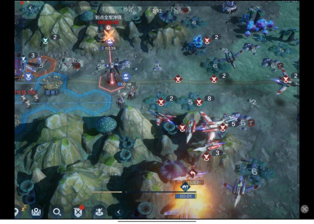 在17点半左右,以钢铁洪流,地空一体的形式,成功铺到了距6级城还有4格左右的位置(图为铺路刚出山口时)。