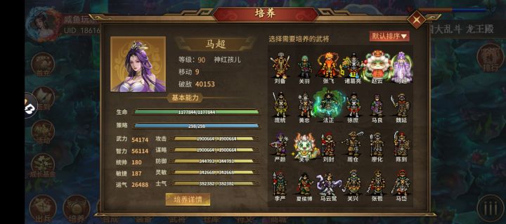 马超:红孩儿/忍者,双血攻,名门,法必,左右虎符加血的123,两仪,真伤,克制,智勇双全*3,士气加工,其他有的没的特技随便吃点。吃三种果攻智士,核心是的有天女和专属羁绊。