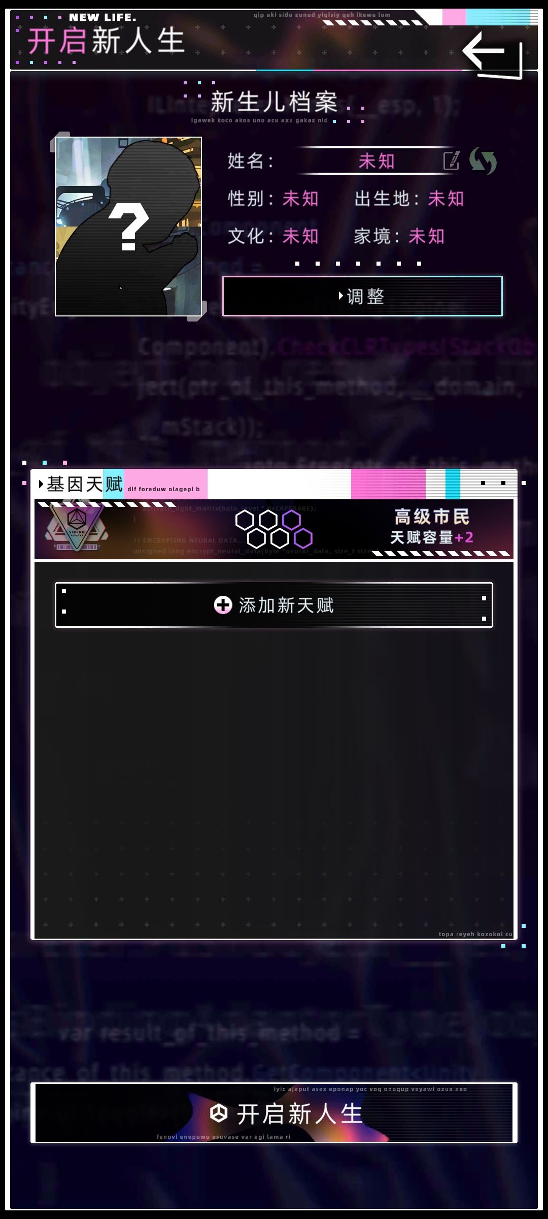 咱们先看上半部分,点击调整(如果没有高级市民可以跳过这一段)。文化(决定姓氏)、性别选你喜欢的就好;出生地的话,楼主首推万井街,至于原因等到后面选具体居住地的时候再说;家境其实影响不大,之前开服的时候有很多不停刷父母职业和资产的,但其实都是纯浪费精力,父母的资产只要能满足供你上中等教育就足够了,至于不满足的情况除非你刻意搞,不然概率很小