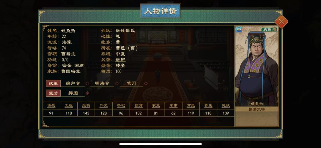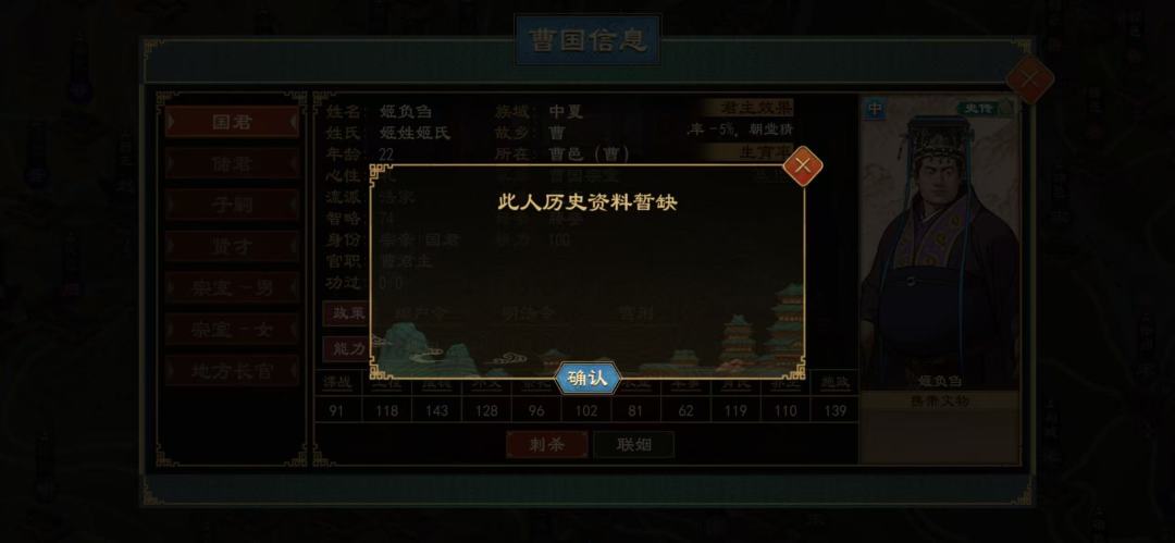 大周这里对负刍的设定大致没有问题,但似乎年龄设置的小了些:在我的存档中时间为前569年,也就是说游戏中负刍即位时十三岁,难以想象这么个年纪能成功弑兄夺位。大周中有些历史储君出现的似乎有些晚,以致年龄太轻,可以调节下。