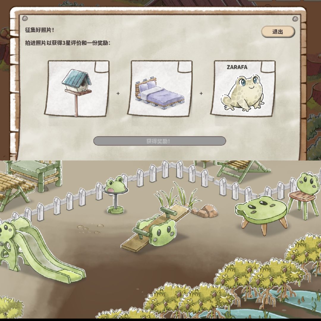 2️⃣完成拍照任务,会得到青蛙主题家具(p4),照片需要同时存在任务需求的三种物品,如果分不清是哪种青蛙。可以打开培育屋,点右上角青蛙标志对比一下。