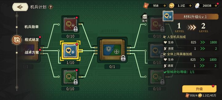3.研发就是解锁机兵的定位和技能,需要用到抽卡券升级解锁,同时升级的属性反馈到全体英雄,有宝贵的速度属性等。(前3个拉满大概花费200多300抽卡券,想要第一时间拉满记得预留)