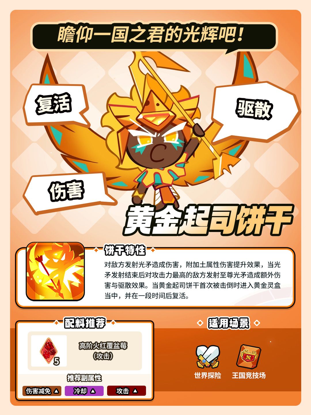 对敌方发射光矛造成伤害,附加土属性伤害提升效果,当光矛发射结束后对攻击力最高的敌方发射至尊光矛造成额外伤害与驱散效果。当黄金起司饼干首次被击倒时进入黄金灵盒当中,并在一段时间后复活。