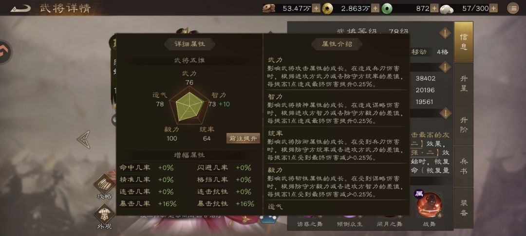 智力 73 慧心玲珑,非为谋主。良好智力,体现其完成复杂计策所需的智慧与演技,而非真正的军师之才。