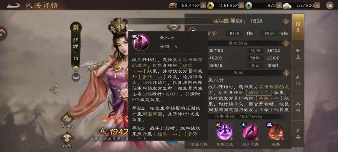 2星(优化):普攻与反击变为【妙曼】(对单个目标造成谋略伤害),优化输出与怒气获取效率,符合其以“魅”伤人的特点。