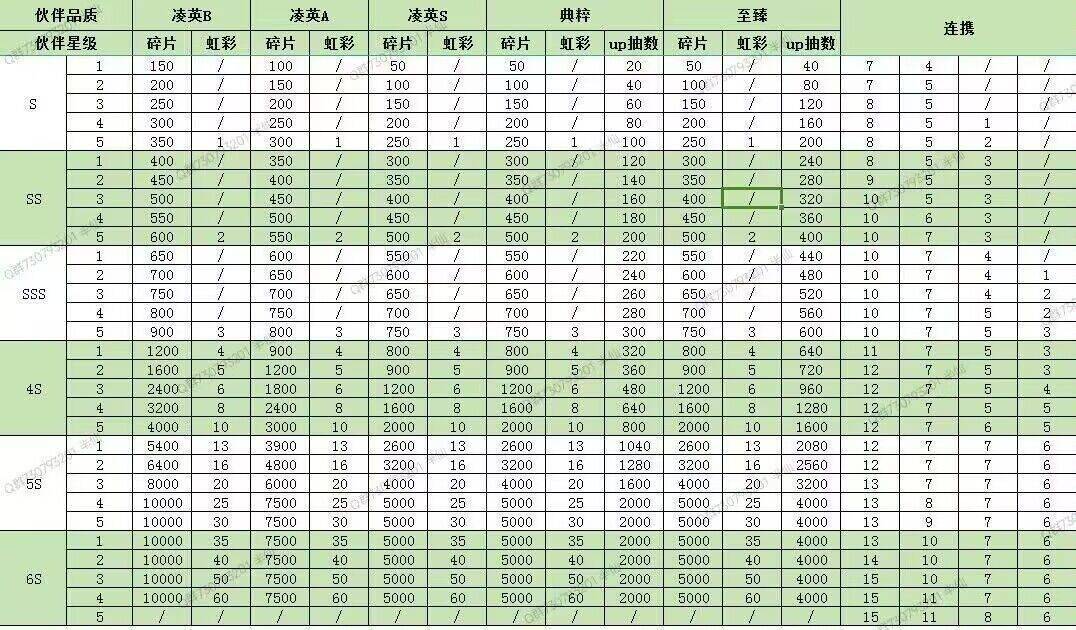 伙伴碎片升星up抽数参考图(7s-9s预测需求)及命石升星需求表。