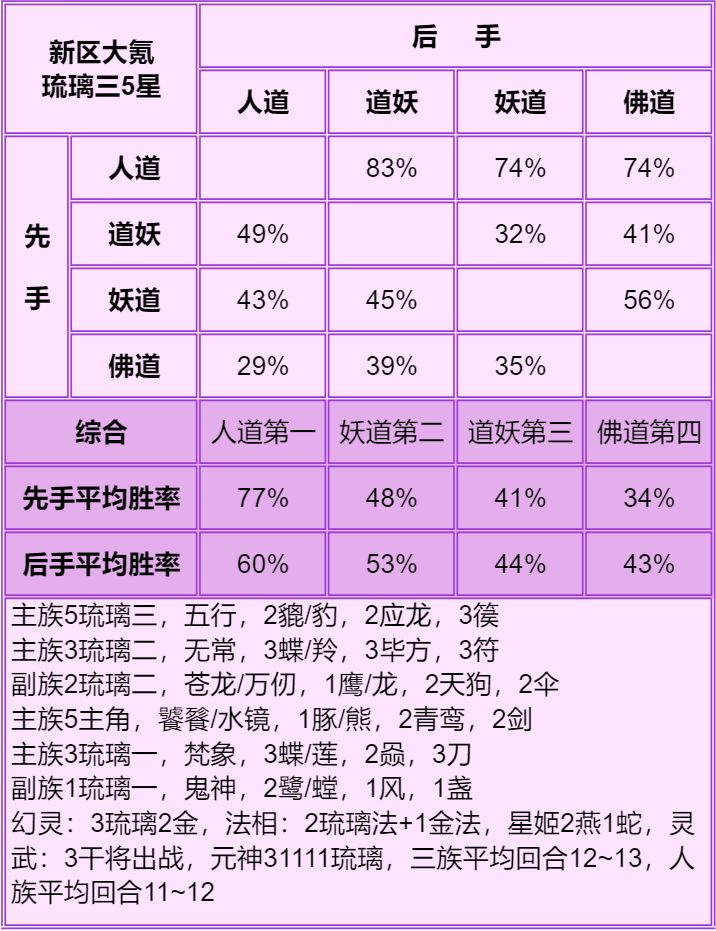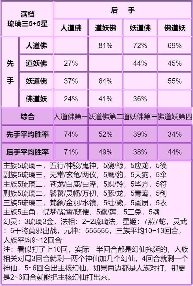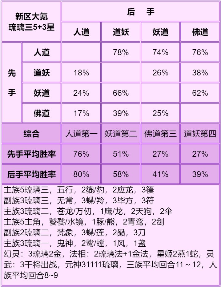 3.胜率表从左往右看,横排的先手打竖排的后手,写的是先手胜率,每个胜率均切磋了100场,胜率表中差距低于5%的可视作没区别,正常胜率浮动都不止5%。