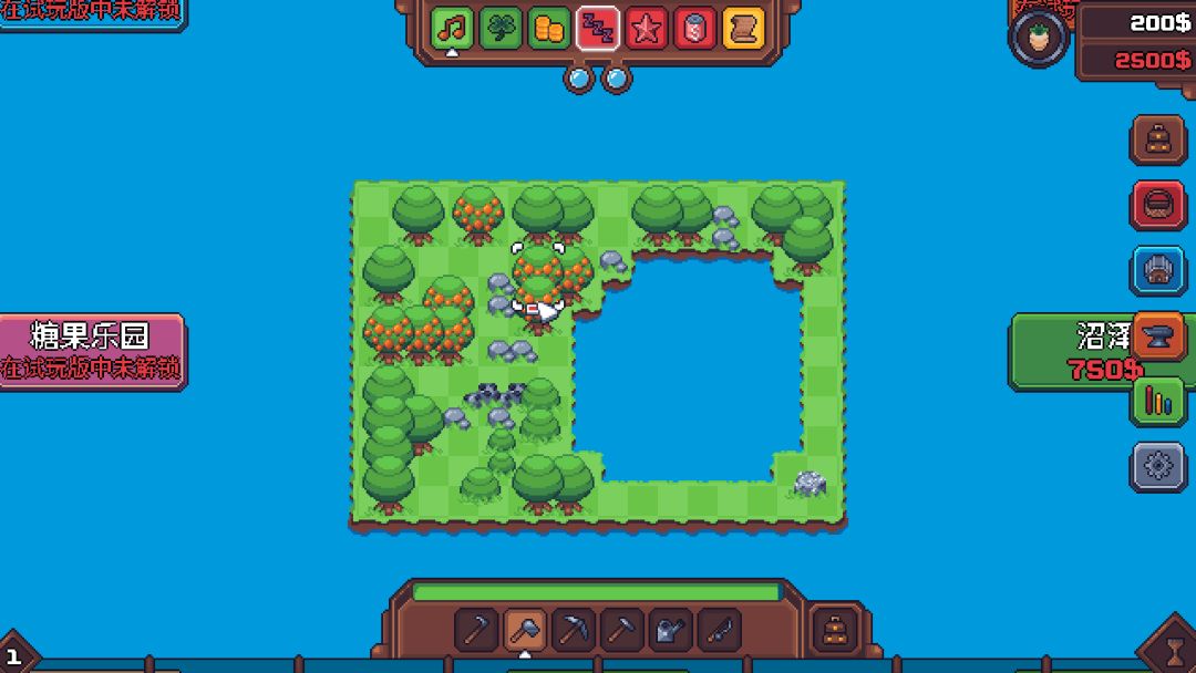 这个游戏并没有局外成长系统,这对于害怕太肝的玩家,是一个好消息。但是,游戏为了保证耐玩性,依然做了许多的有趣内容。在地块拓展方面,不同的地块的有着不同的生物群落特性,例如作为游戏初始地图的平原,其生物群落特性为斧子效率加1。游戏设计了大量的地块,包括平原、山脉、沼泽、丛林、火山、糖果乐园、沙漠、火山等,能给玩家带来极大的充实感。不过,在试用版里,只开放了平原、山脉、沼泽等几个地块,而剩下的地块都需要等待正式的版本。