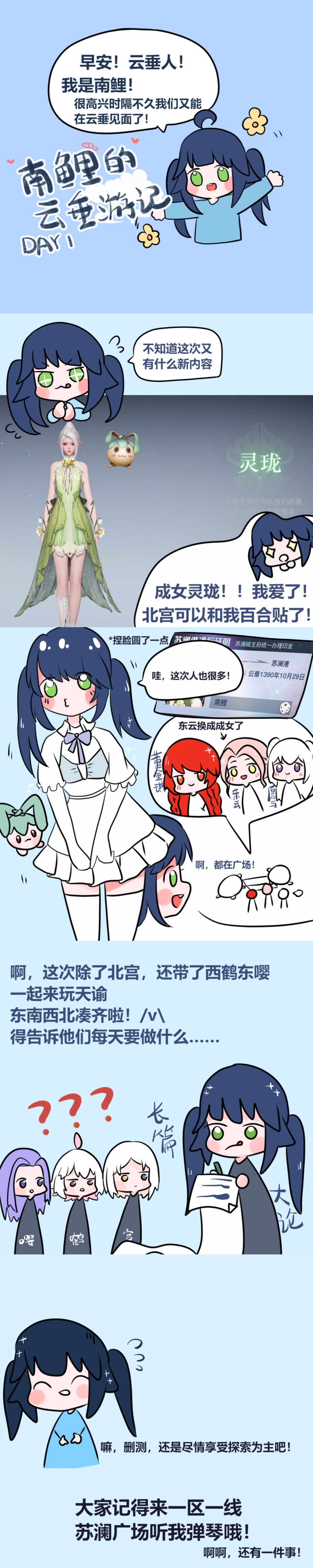 大家好我是南鲤!!很高兴又能和大家在云垂见面了!!这次又加了很多新东西!!(兴奋地搓搓手)拍照,宝箱,英灵,攻略npc,打牌,炸广场!!!我来啦!!!!!(今天还不能炸广场TT)还有还有,欢迎加入东云愿与董金琪大佬的粉丝群!
