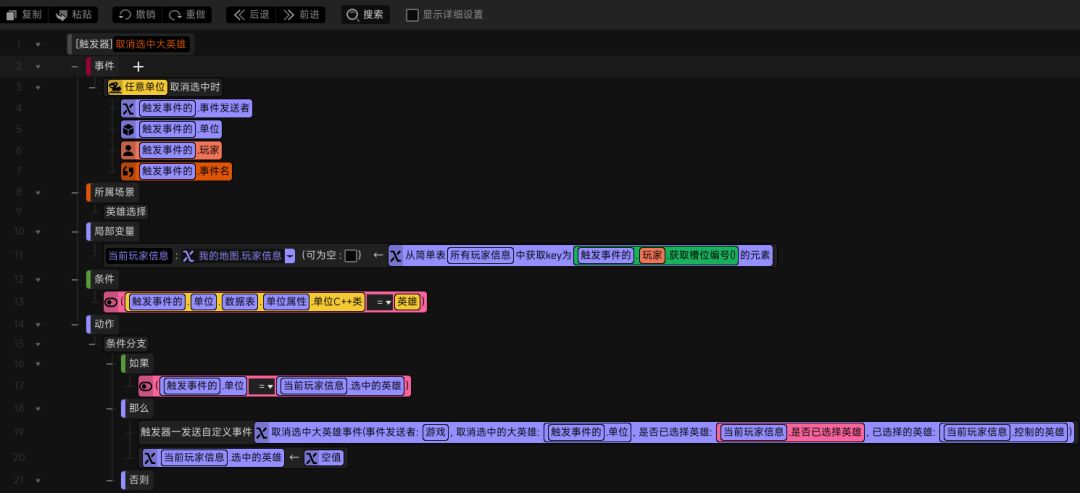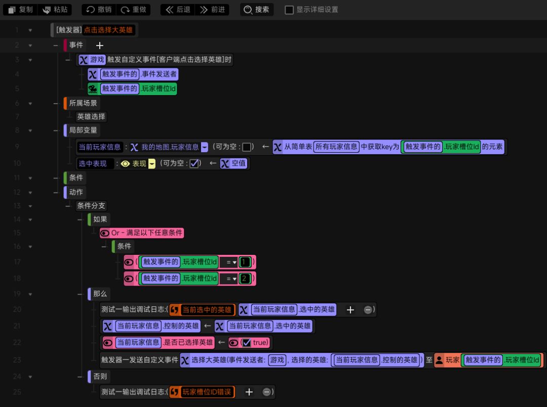 而当玩家在未选定英雄,但已经选中了某个英雄的情况下,点击相应可附着面板上的“选择”按钮,客户端发送过来的事件会触发这个触发器——将选中的英雄赋值给当前玩家信息中玩家控制的英雄,给客户端发送事件并将选择的英雄通过事件参数发送给客户端(P8)