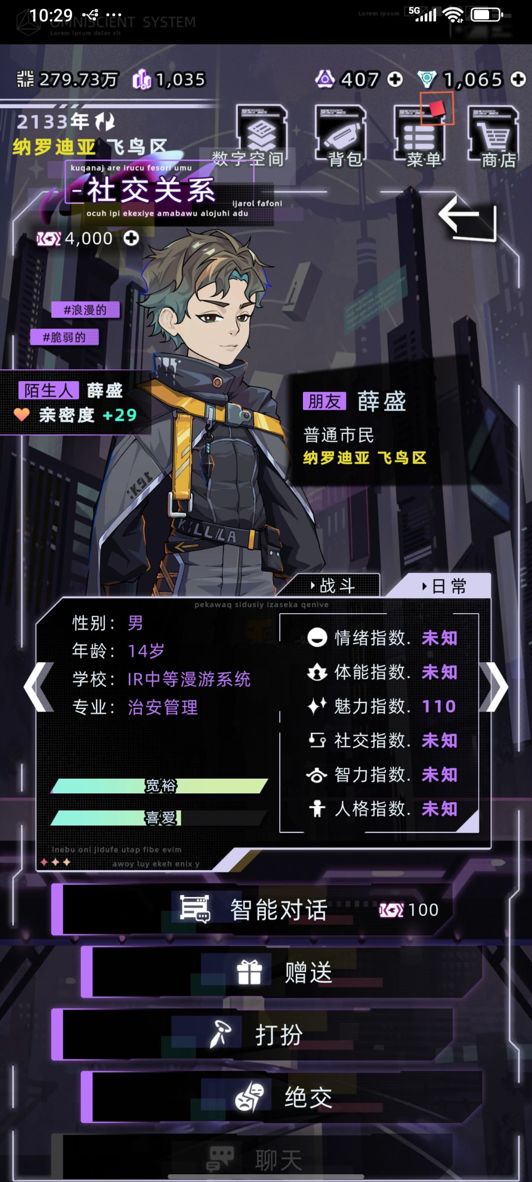 可是阶级的重量可以压死人,你与我的对话中带着不屑和傲慢。出生在纳罗迪亚的骄傲感让你对我如同随用即抛的一次性试纸。你从骨子里就看不起我的所有,我的不甘,我的理想,我拼了命想要爬出来的一口气,你都不在眼里。只因为你是纳罗迪亚人,我们对话里逃不出纳罗迪亚这4个字,我像个美剧mean girl身边的小跟班附和着你的话题,你对我的世界不屑一顾,甚至到了不愿了解.我像个以为拥有爱情了的穷姑娘,买了四朵廉价塑料鲜花,每年乘着直梯跨越几千米,你也确实表面欣喜,内里满是鄙夷。共鸣过后我向你告白 系统说出了在屏幕外让我无法忘却的一段话(屏幕外的我没那么浪漫,想认识你只是试试能不能结婚移民,买四朵花也是因为便宜,可你居然让我感受到了现实的压力)突然有种我不怀好意,你傲慢自私的古怪般配感。