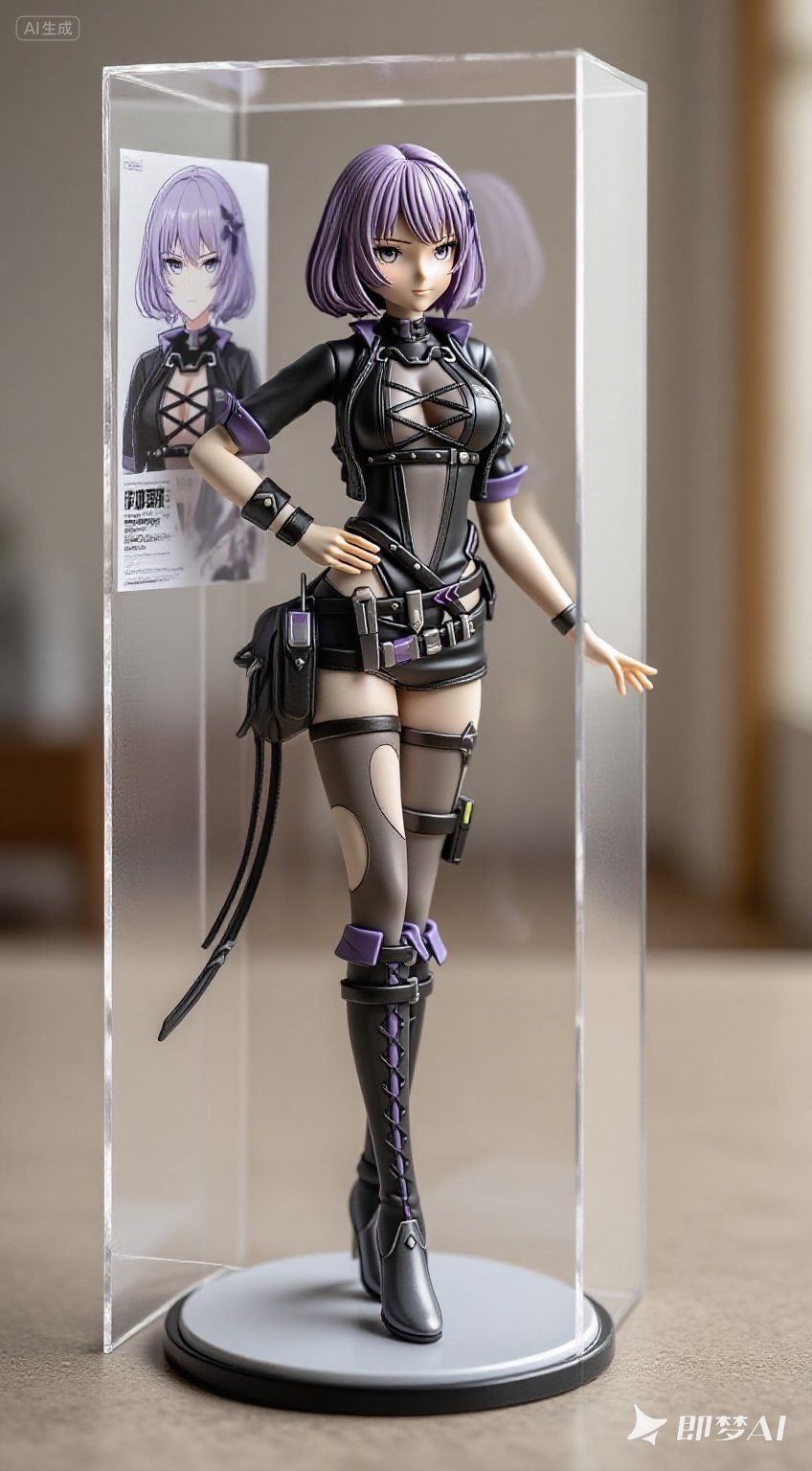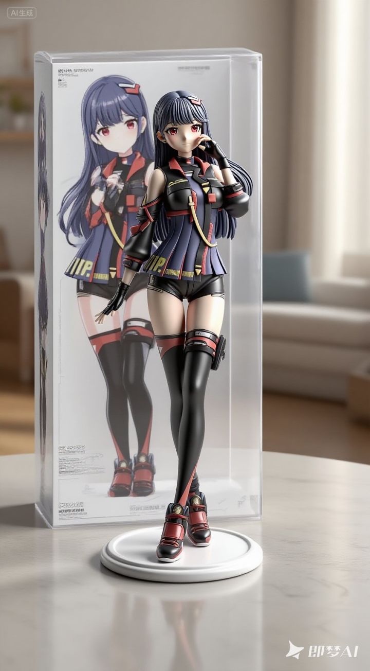 请把这张照片做成一个人偶手办。细节逼真,在人偶后面,要有一个半透明的塑料纸盒,上面印着这张照片里的人物形象。在纸盒前面,一个圆形塑料底座上放置我给你的这张照片的人偶版本。我希望聚氯乙烯(PVC)材料能清晰体现出来。背景是室内场景