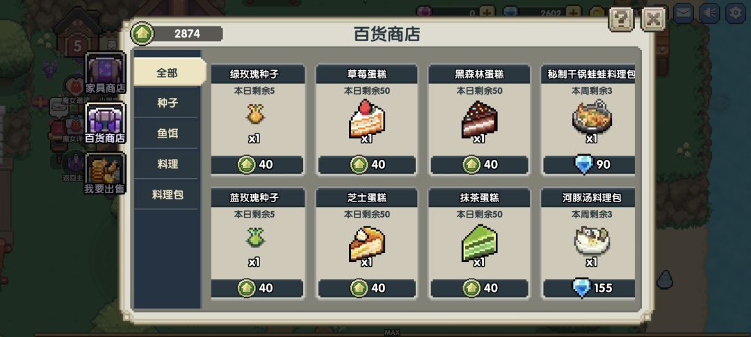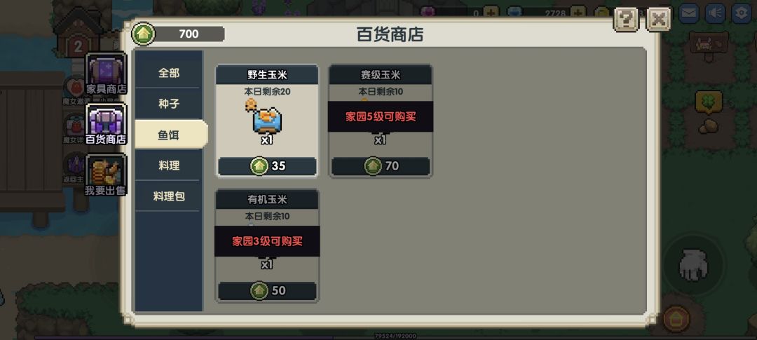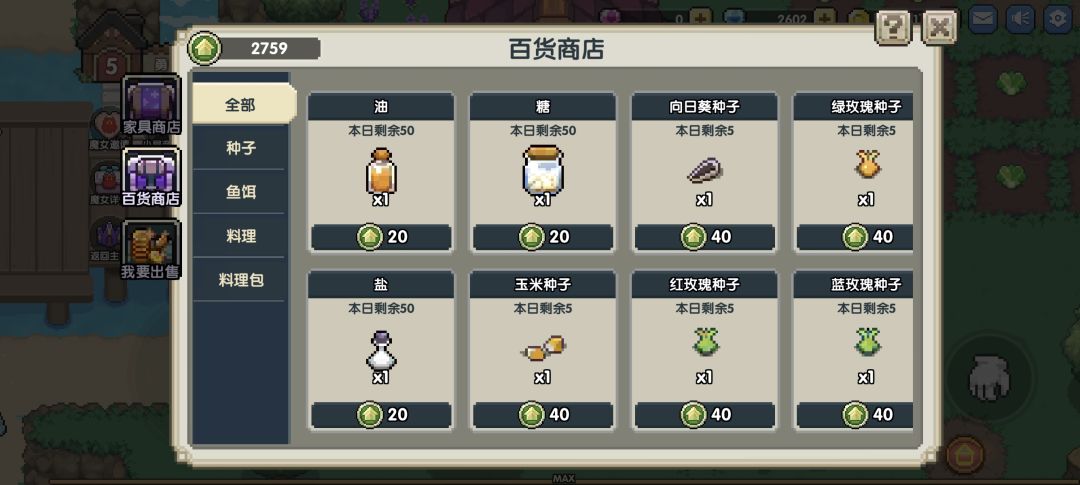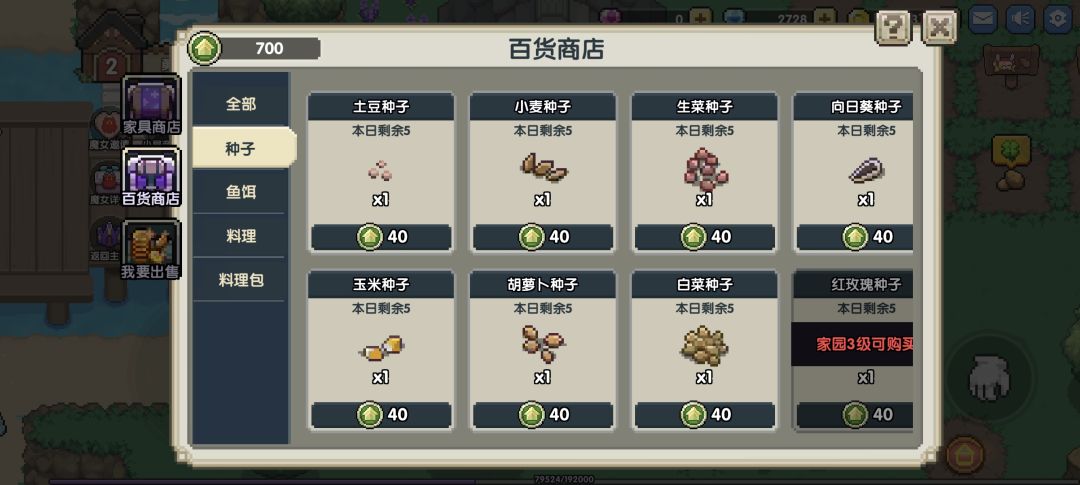 稍微提一下家具,家具商店最低价的家具是200币一个的4把木椅和200币一个的5个备忘贴还有200币一个的5个烛光灯,其他都是500币往上,但实际上还有很多200币的家具可以搞