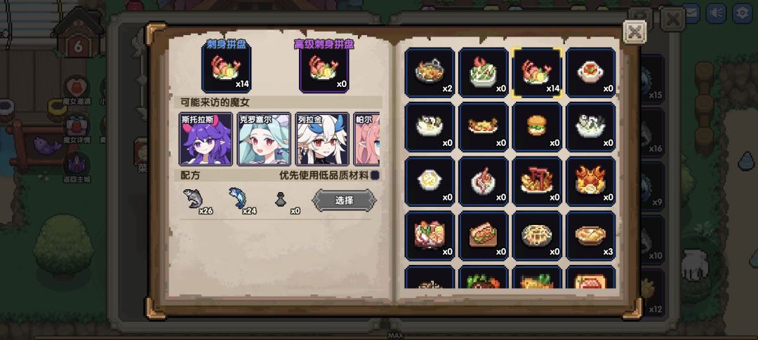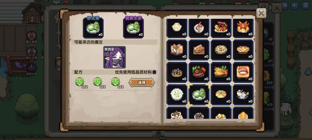 (假设)你打算养白菜姐,有多余材料时,可以先任意做几个白菜汤以外的料理,来的魔女不是白菜姐就丢出去继续做菜,攒够投喂物了,就搓白菜汤或者通用料理捞她